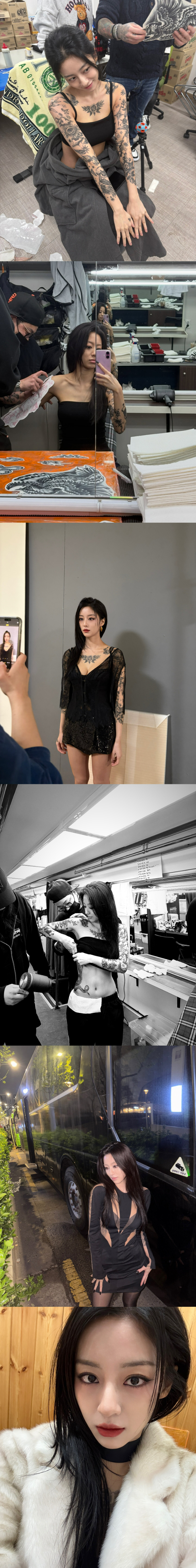 이에 사진엔 강민아의 파격적인 비주얼이 담겼다. 무려 '전신 타투' 분장을 시도한 것. 강민아는 양 팔뚝, 쇄골은 물론 등 전체에 화려한 타투 분장을 새긴 노력으로 반전 매력을 꾀했다. 전에 없던 강렬한 이미지에 팬들은 놀라움을 금치 못하고 있다.