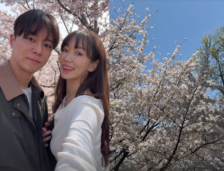 사진 속 두 사람은 벚꽃을 배경으로 포즈를 취하며 미소를 짓고 있다.
