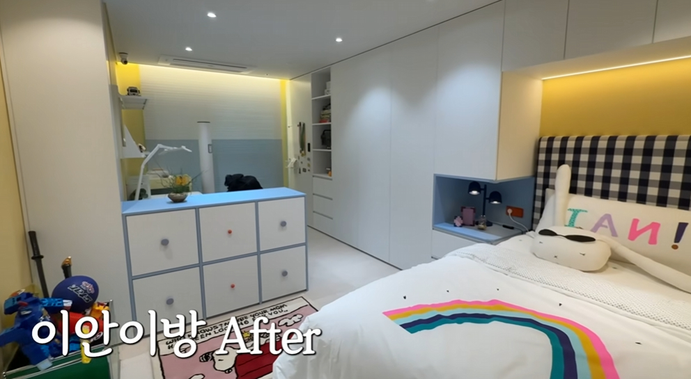 이시영은 집 소개에 앞서 "오늘 청소만 5시간"이라며 혀를 내둘렀다. 이어 현관 복도에 전시된 그림에 대해 "이안이가 6살 때 그린 작품"이라고 말했다. 이어 "제일 신경을 많이 쓴 공간은 이안이 방"이라며 첫째 아들의 방을 공개했다.