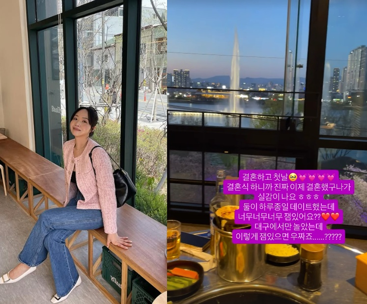 이어 "결혼하고 첫날. 결혼식 하니까 진짜 이제 결혼했구나가 실감이 나요"라며 "하루종일 데이트 했는데 너무너무너무 재밌어요. 대구에서만 놀았는데 이렇게 재밌으면 어쩌죠"라고 전했다.
