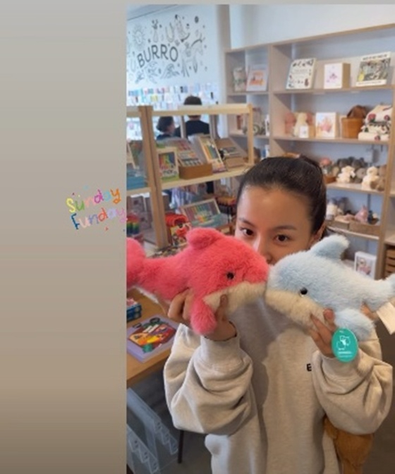 공개된 사진 속 이하이는 아기자기한 소품 숍으로 보이는 공간에서 핑크색과 하늘색 돌고래 인형을 양손에 든 채 카메라를 응시하고 있다.
