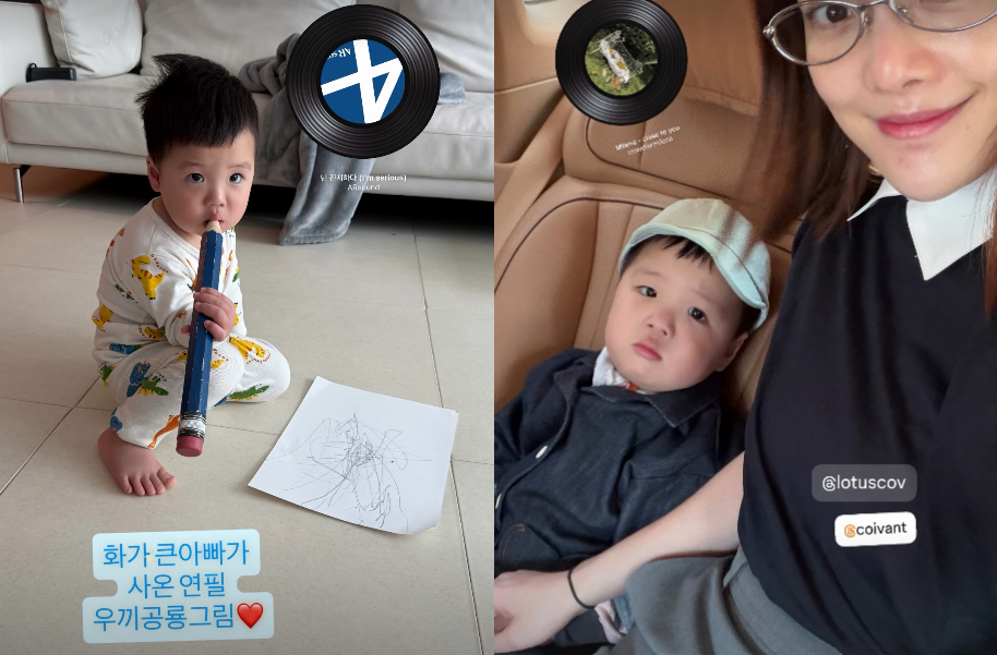이어 황보라는 아들이 연필을 들고 그림을 그리는 모습을 공개하며 "화가 큰아빠의 사 온 연필. 공룡 그림"이라고 덧붙였다.