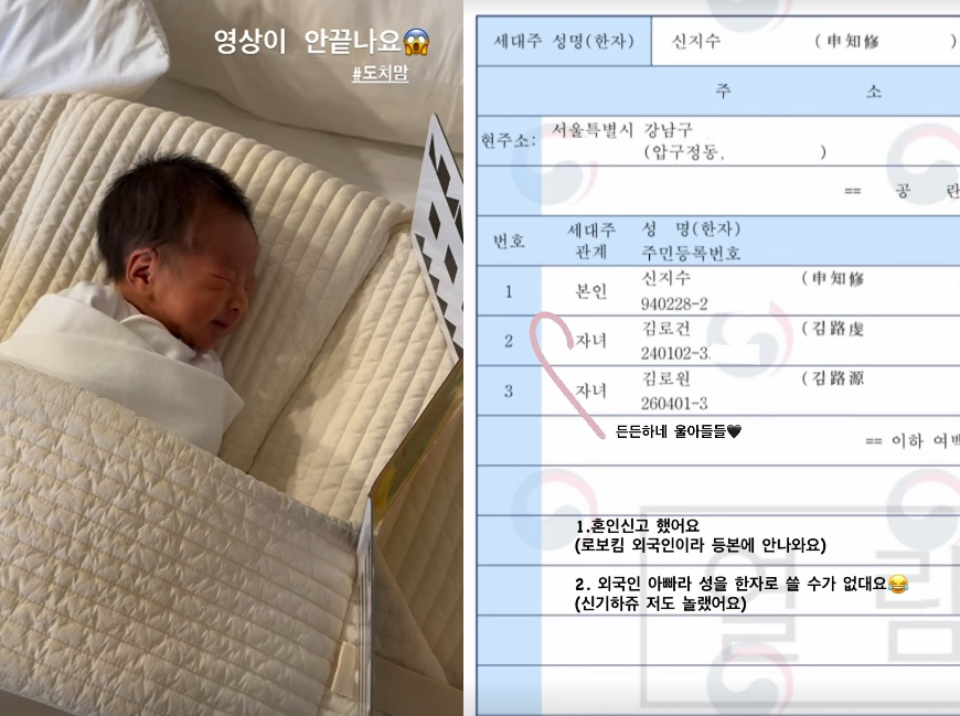 이어 지수는 주민등록등본도 공개하며 "혼인신고 했어요"라고 전하고 자신의 남편이 외국 국적이라고도 전했다. 지수는 "외국인이라 등본에 안 나온다. 외국인 아빠라 성을 한자로 쓸수 없대요"라고 설명했다.