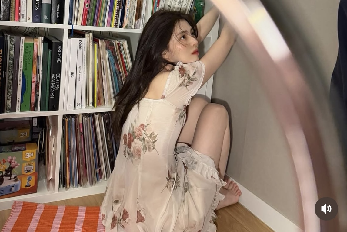 또 다른 사진에서 한소희는 책장 옆 바닥에 앉거나 누운 채 포즈를 취하며 한층 부드럽고 서정적인 무드를 더했다. 따뜻한 조명 아래 자연스럽게 흘러내린 헤어와 내추럴한 스타일링으로 한소희 특유의 감성이 느껴졌다.