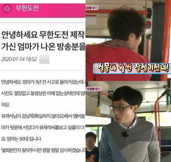 작성자는 "'무도' 제작진, 팬 여러분, 돌아가신 엄마가 나온 방송분을 찾고 있다"라면서 "엄마가 3년 전 사고로 돌아가셨는데 시간이 갈수록 너무 그립다. 사진도 몇 장 없고 동영상은 아예 없는 상태인데, 엄마가 '무도'에 잠깐 나왔던 게 생각났다"라고 전했다.