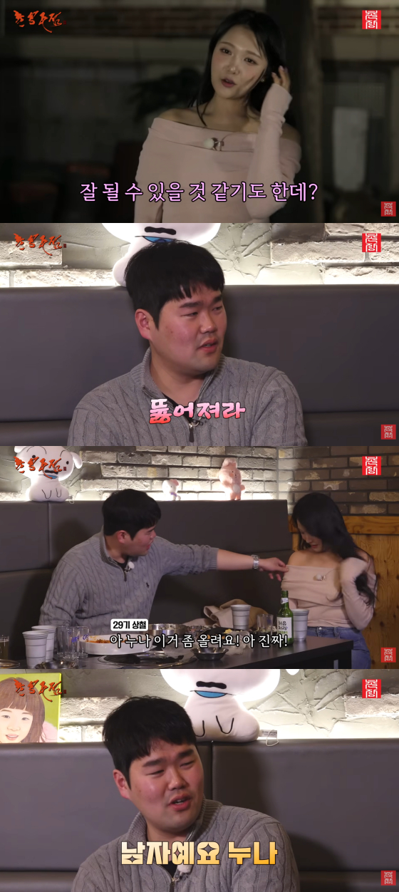 옥순은 자연스럽게 상철의 옆자리로 옮겼고, 상철은 갑자기 옥순의 손을 잡더니 "우리 누나 수족냉증 있다. 어떻게 하냐"면서 걱정했다.