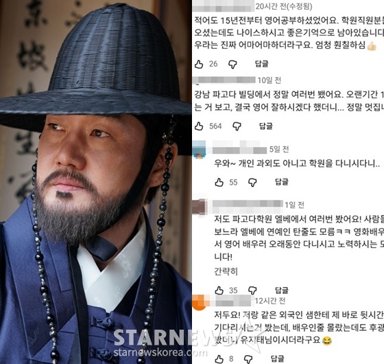 또한 "강남 파고다 빌딩에서 정말 여러 번 뵀다. 오랜 기간 1 대 1 회화 다니시는 거 보고, 결국 영어 잘하시겠다 했더니.. 정말 멋지시다", "저도 파고다 학원 엘리베이터에서 여러 번 봤다. 사람들이 전부 휴대폰 보느라 엘리베이터에 연예인 탄 줄도 모름. 영화배우가 사이에 섞여서 영어 배우러 오랫동안 다니시고 노력하시는 모습 감동했다", "저도 봤다. 저랑 같은 외국인 샘(선생님)한테 제 바로 뒷 시간에 수업하셔서 기다리시는 거 봤다. 배우인 줄 몰랐는데도 후광이 비쳐 다시 봤더니 유지태더라" 등 댓글이 달렸다.