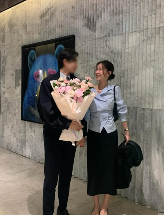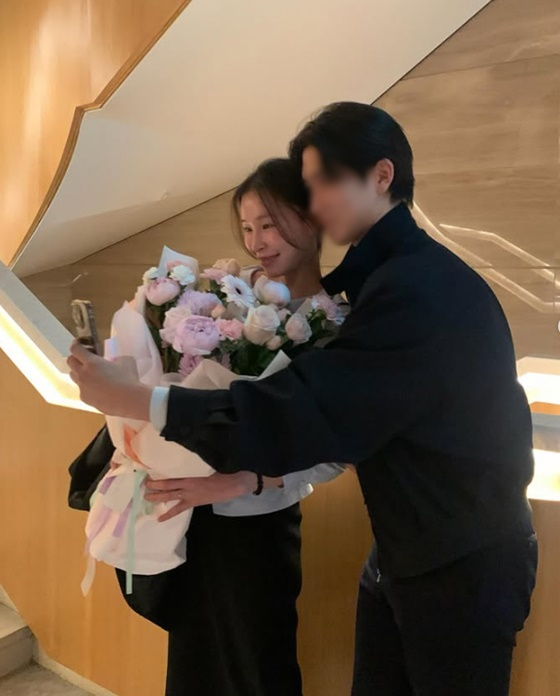 사진 속 정혜임은 생일을 맞아 예비 신랑에게 선물받은 것으로 보이는 대형 꽃다발을 들고 있다.
