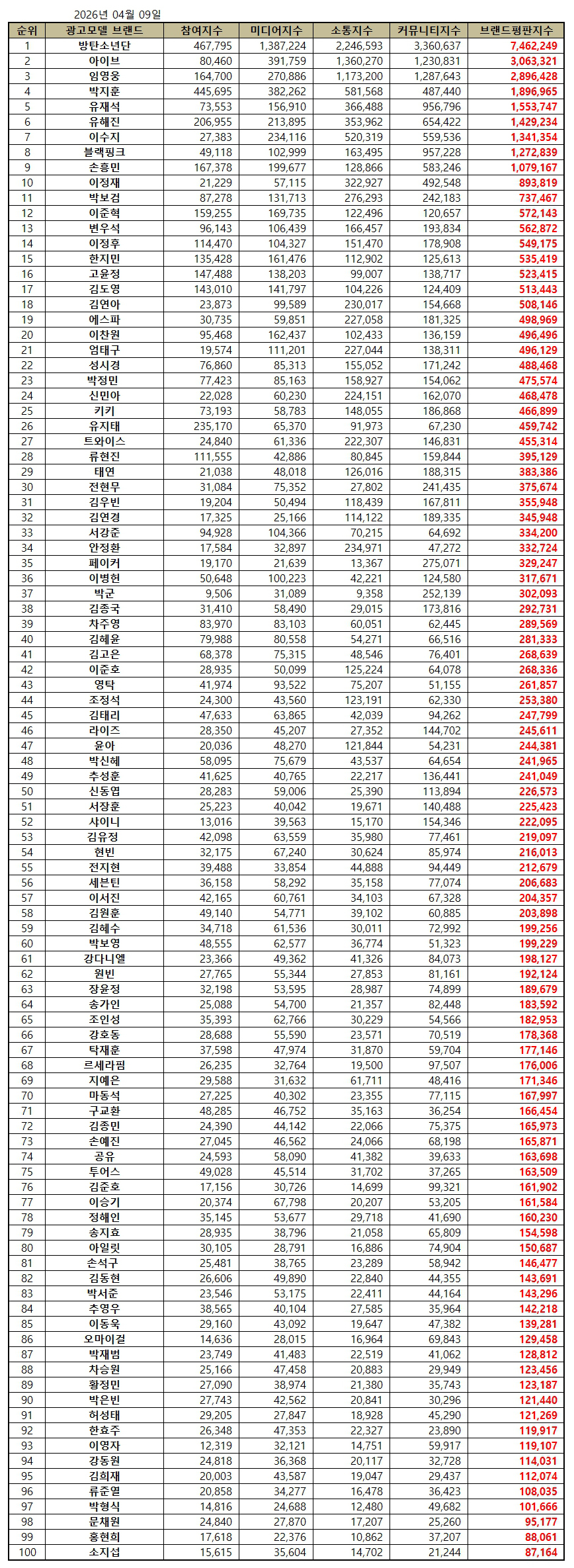 한국기업평판연구소는 2026년 3월 9부터 2026년 4월 9일까지 측정한 광고모델 브랜드 빅데이터 46,480,909개를 소비자 행동분석을 통해 광고모델 브랜드에 대한 참여지수, 미디어지수, 소통지수, 커뮤니티지수로 브랜드평판지수를 측정했다. 지난 3월 광고모델 브랜드 빅데이터 40,956,804개와 비교하면 13.49% 증가했다.