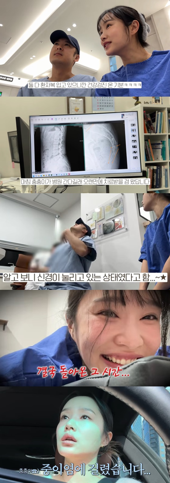 그는 자막을 통해 '무거운 거 들거나 오래 서 있거나 하면 아프더라. 마침 남편이 병원 간다길래 오랜만에 치료받을 겸 왔다'고 설명했다.