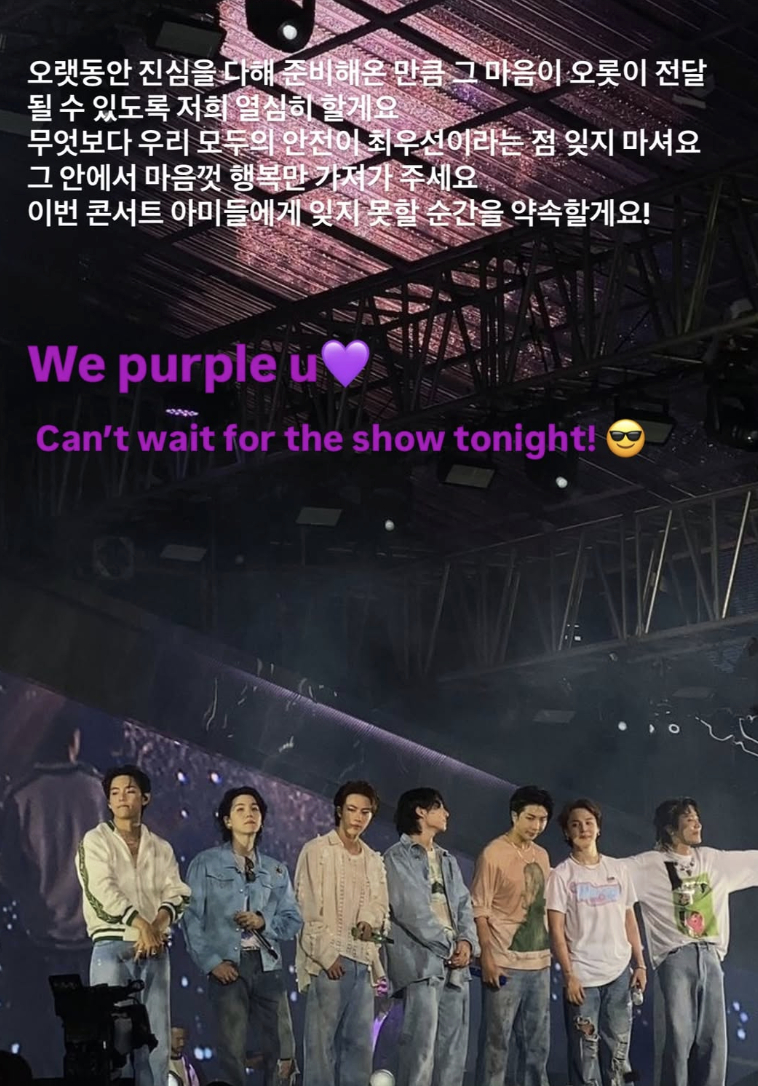 그러면서 "이번 콘서트, 아미들에게 잊지 못할 순간을 약속하겠다"고 다짐했다.