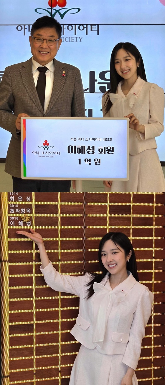 이에 이혜성은 10일 자신의 인스타그램에 인증 사진과 함께 소감을 남겼다. 그는 "서울에서 483번째로 아너 소사이어티 회원이 됐다. 제 명의의 집도 없는 제가 이런 기부에 동참하는 게 가당치 않을 수도 있지만, 나눔에 TPO가 따로 있을까 싶기도 했다. 패기 넘치는 젊은 시기에 하루라도 빨리 동참해 보고 싶었다"라고 진솔하게 터놓았다.