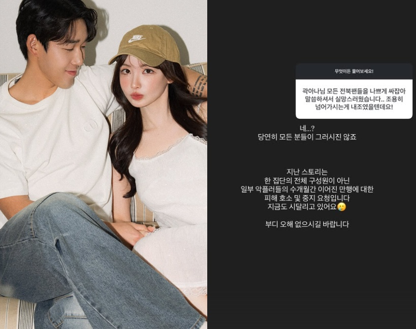 이에 곽민선 아나운서는 "네? 당연히 모든 분들이 그러시진 않죠"라며 "지난 스토리는 한 집단의 전체 구성원이 아닌 일부 악플러들의 수개월 간 이어진 만행에 대한 피해 호소 및 중지 요청입니다. 지금도 시달리고 있어요. 부디 오해 없으시길 바랍니다"라고 답했다.