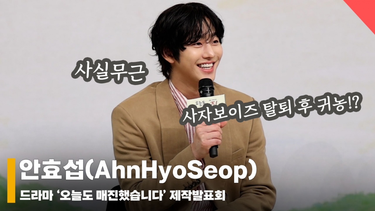 연예방송안효섭(AhnHyoSeop), '사자 보이즈 탈퇴!? 사실 무근' [영상]발행 : 2026.04.15 ・ 14:46조회수 :오찬우 기자15일 오후 서울 양천구 목동 SBS에서 드라마 '오늘도 매진했습니다' 제작발표회가 열렸다.이날 배우 안효섭, 채원빈, 김범이 참석했다. 2026.04.15<저작권자 © 스타뉴스, 무단전재 및 재배포 금지>브리핑추천 기사오찬우 기자기자홈좋아요연예-방송의 인기 급상승 뉴스연예-방송의 최신 뉴스AD