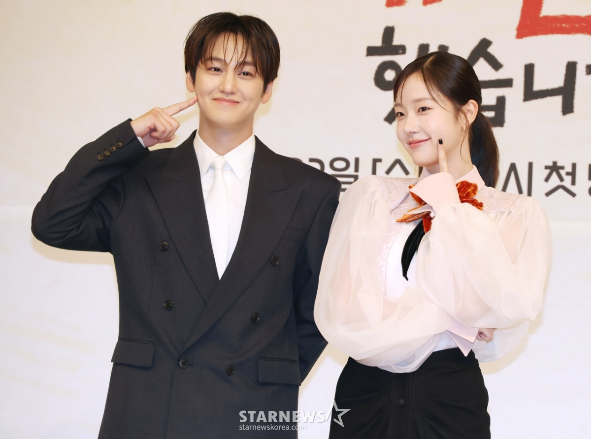 배우 김범, 채원빈이 15일 오후 서울 양천구 목동 SBS에서 진행된 SBS 수목드라마 '오늘도 매진했습니다' 제작발표회에 참석해 포즈를 취하고 있다. /2026.04.15