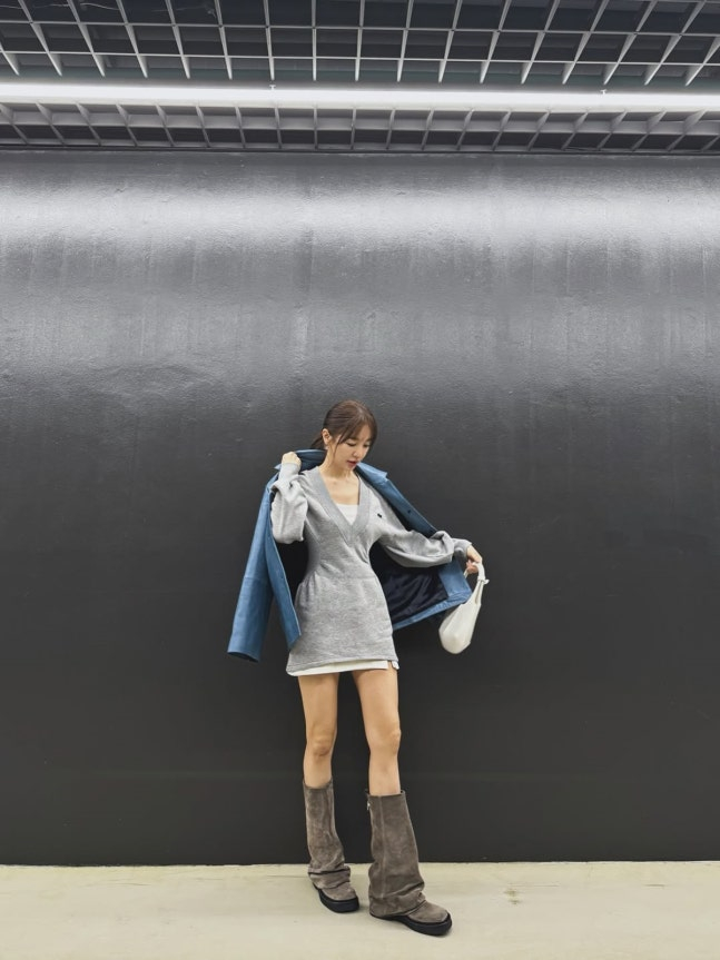 공개된 사진은 벽 앞에서 포즈를 취하고 있는 윤은혜의 모습을 담고 있다. 사진 속 윤은혜는 블루 재킷에 니트 원피스, 스웨이드 부츠를 매치해 감각적인 패션을 연출하고 있다.