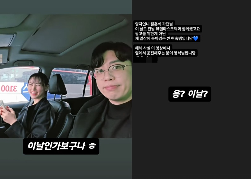 28기 영식은 "영자언니 결혼식 가던날 영상에서 옆에서 운전해부는 분이 영식님"이라는 글에 "응? 이날?"이라고 답했다. 이후 28기 영식은 영자와의 차 안 커플 셀카와 함께 "이날인가보구나"라고 인증했다.