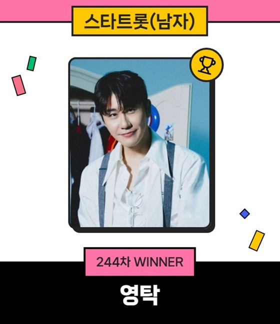 영탁은 지난 9일 오후 3시 1분부터 16일 오후 3시까지 진행된 244차 스타랭킹 스타트롯 남자 랭킹 투표에서 23만 965표를 획득하며 1위에 이름을 올렸다.