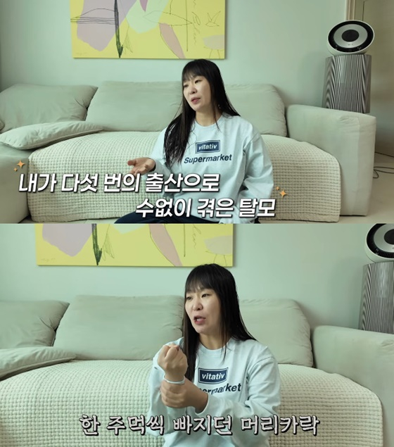 정주리는 "내가 다섯 번의 출산을 하면서 수없이 탈모를 겪었다. 머리를 감고 나면 머리카락이 한 주먹씩 나왔다"고 말했다.