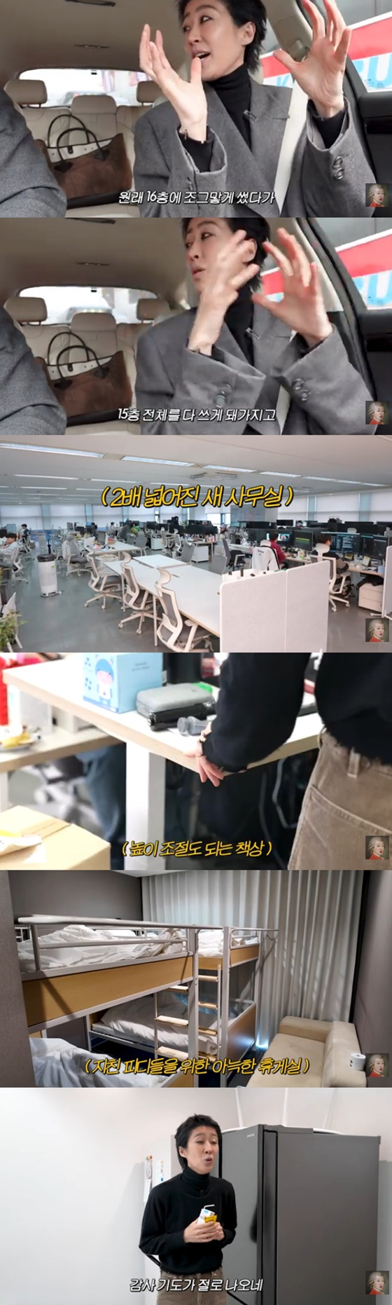 200평 규모의 사옥도 공개됐다. 사무실은 2배 넓어진 평수로 눈길을 끌었다. 사무실에는 높이가 조절되는 책상도 있어 눈길을 끌었다.