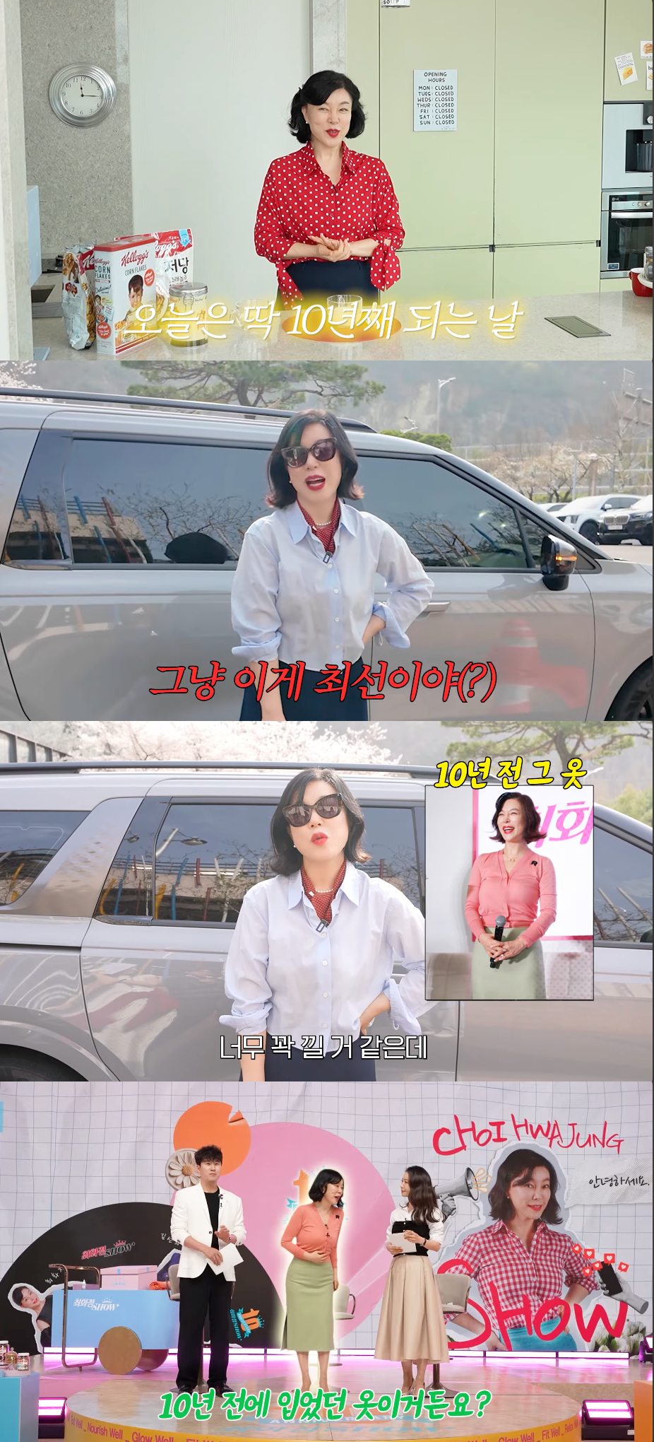 최화정은 10년 전 첫 방송 당시 입었던 의상을 다시 입겠다 했지만 쉽지 않았다. 그는 "되게 설레고 기념적인 날인데 미모가 못 끌어올렸다"며 "살을 못 뺐다. 그 옷이 너무 꽉 낄 것 같다. 너무 끼면 다른 걸로 입으려고 한다"고 걱정을 토로했다.