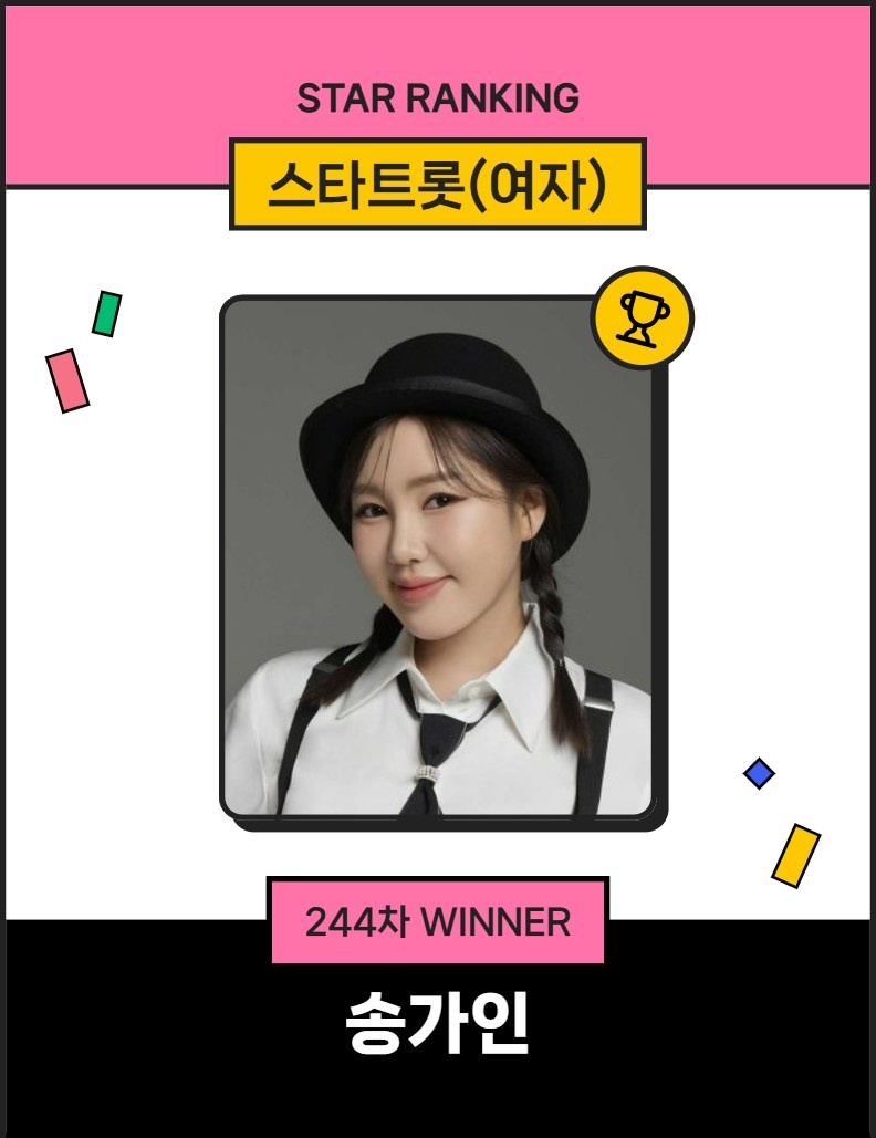 송가인은 9일 오후 3시 1분부터 16일 오후 3시까지 진행된 244차 스타랭킹 스타트롯 여자 랭킹 투표에서 10만 3475표로 1위에 올랐다.