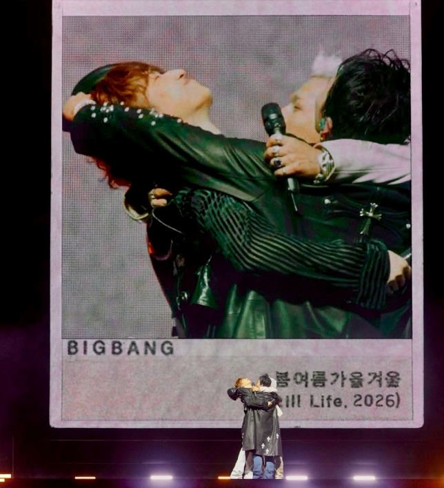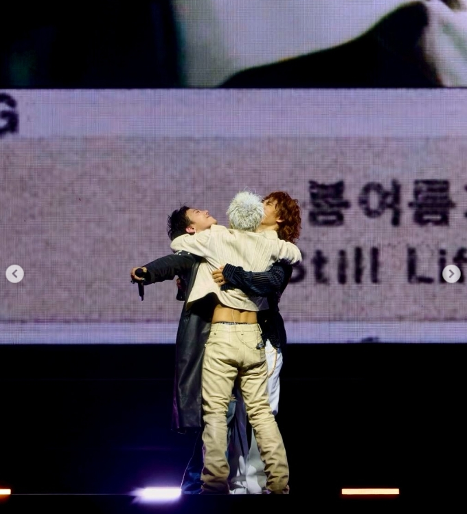 빅뱅 지드래곤이 멤버 태양, 대성과 끌어안고 감동의 순간을 알렸다.