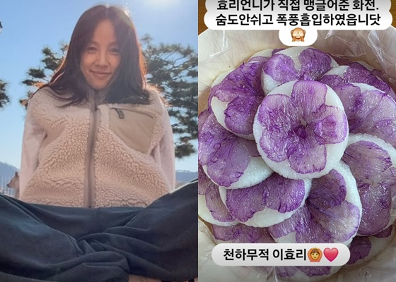 안영미는 20일 자신의 개인계정에 "효리 언니가 직접 만들어준 화전. 숨도 안 쉬고 폭풍 흡입했습니다"라는 글과 사진을 게재했다. 공개된 사진에는 예쁘게 부친 화전이 담겨 있다. 만삭 임산부인 안영미는 "천하무적 이효리"라고 덧붙였다.
