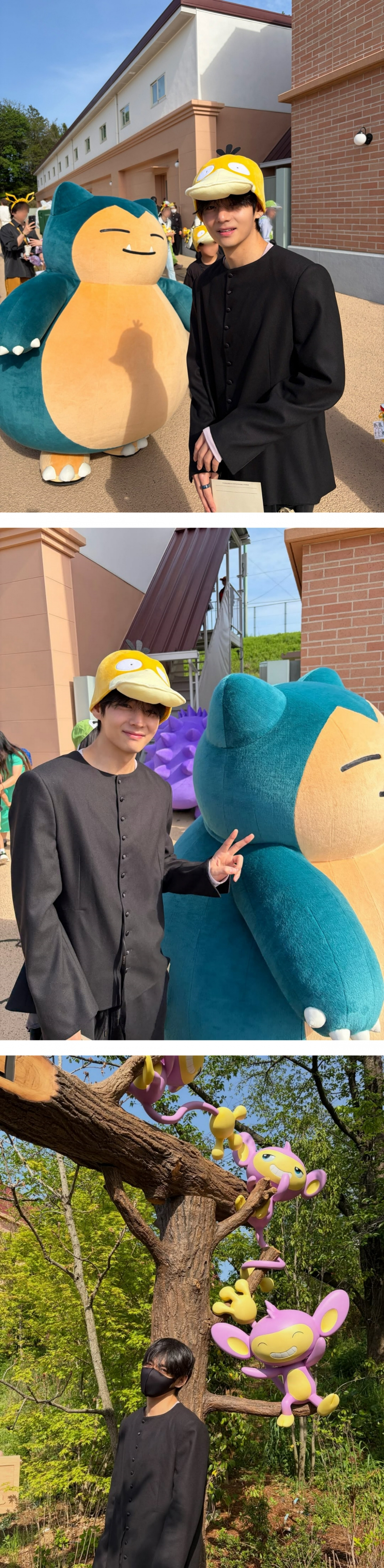 사진에는 일본 도쿄 돔에서 4월 17일 18일 양일간의 콘서트를 마친 뷔가 도쿄에 위치한 포켓몬 테마파크를 방문해 여유를 즐기는 모습이 담겼다.