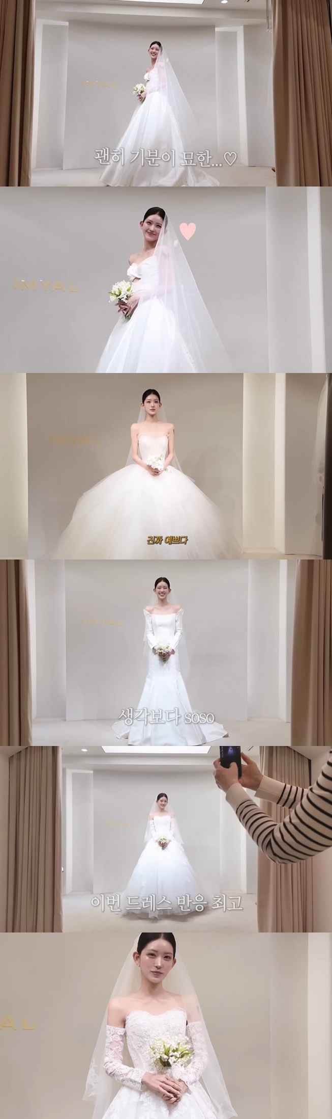 그는 편집자, 헤어 메이크업샵 스태프 앞에서 여러 웨딩스레스를 시착했다. 최준희는 5벌 정도의 웨딩드레스 중 지인들의 반응이 가장 좋은 드레스를 입기로 결정했다.