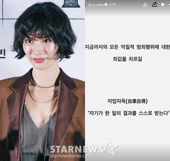 애프터스쿨 출신 가수 겸 배우 나나는 21일 오후 자신의 인스타그램 스토리에 "자업자득(自業自得)"이라며 "자기가 한 일의 결과를 스스로 받는다"라는 풀이를 썼다.