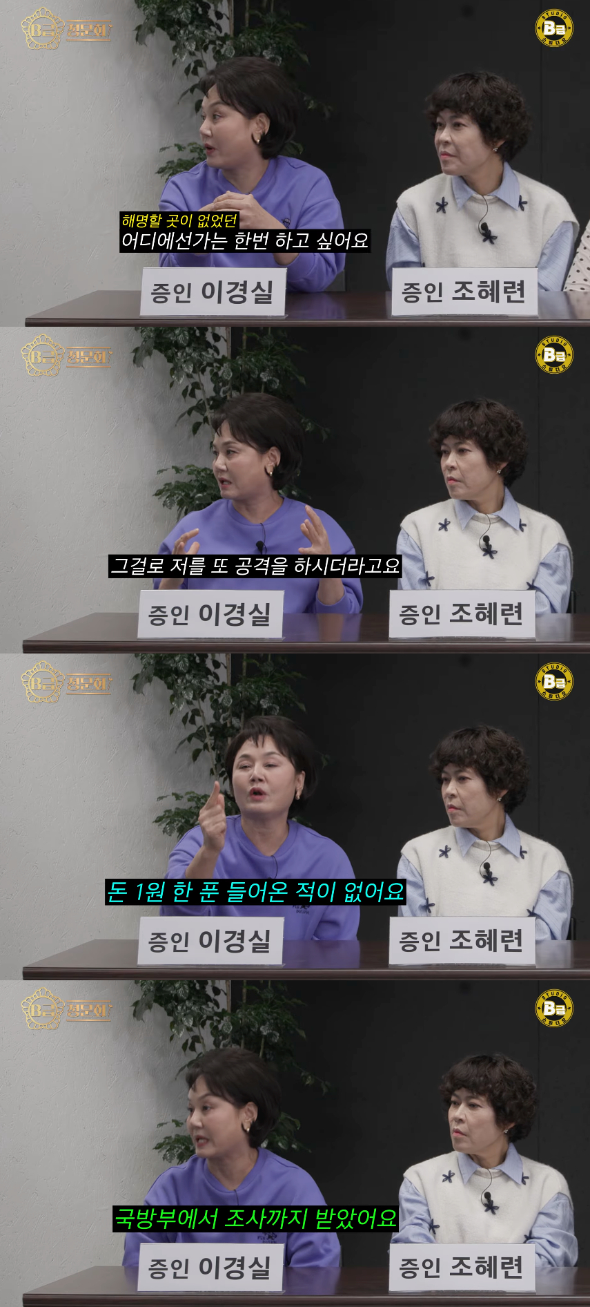 이와 함께 이경실은 아들과 연관된 논란에 대해 "우리 아들이 군대에 갔는데 달걀 회사 대표라서 군인이 사업을 하면 안 된다고 저를 공격하더라"며 "정말 죄송하지만 아직까지 아들 통장에 돈 1원 한 푼 들어온 적이 없다. 아들이 군대에 가서 여론이 있으니 국방부 조사까지 받았다. 그렇지만 통장에 돈이 들어온 적이 없어서 무혐의로 판명이 났다"고 말했다.