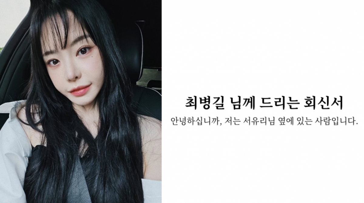 서유리는 26일 장문의 글을 게재했다. 글에는 '최병길 님께 드리는 회신서'라는 제목이 담겼으며 서유리와 열애 중인 연하 법조계 남자친구가 작성한 것으로 보인다.