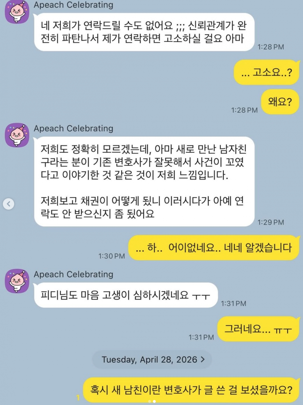 최병길 PD는 28일 "서유리님의 변호사와 나눈 카톡입니다"라는 글과 함께 카카오톡 메시지 대화 내용을 공개했다.