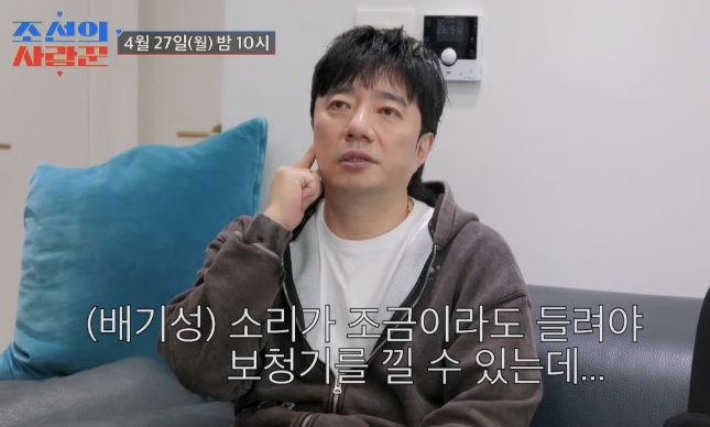 배기성은 지난 27일 방송된 TV조선 예능 프로그램 '조선의 사랑꾼'에서 돌발성 난청으로 치료 중인 모습을 공개했다. 이날 방송에서 그는 "증상이 나타난 지 3달째다. 6개월까지 차도가 없으면 장애 진단을 받을 수 있다고 한다"고 밝혀 안타까움을 자아냈다.
