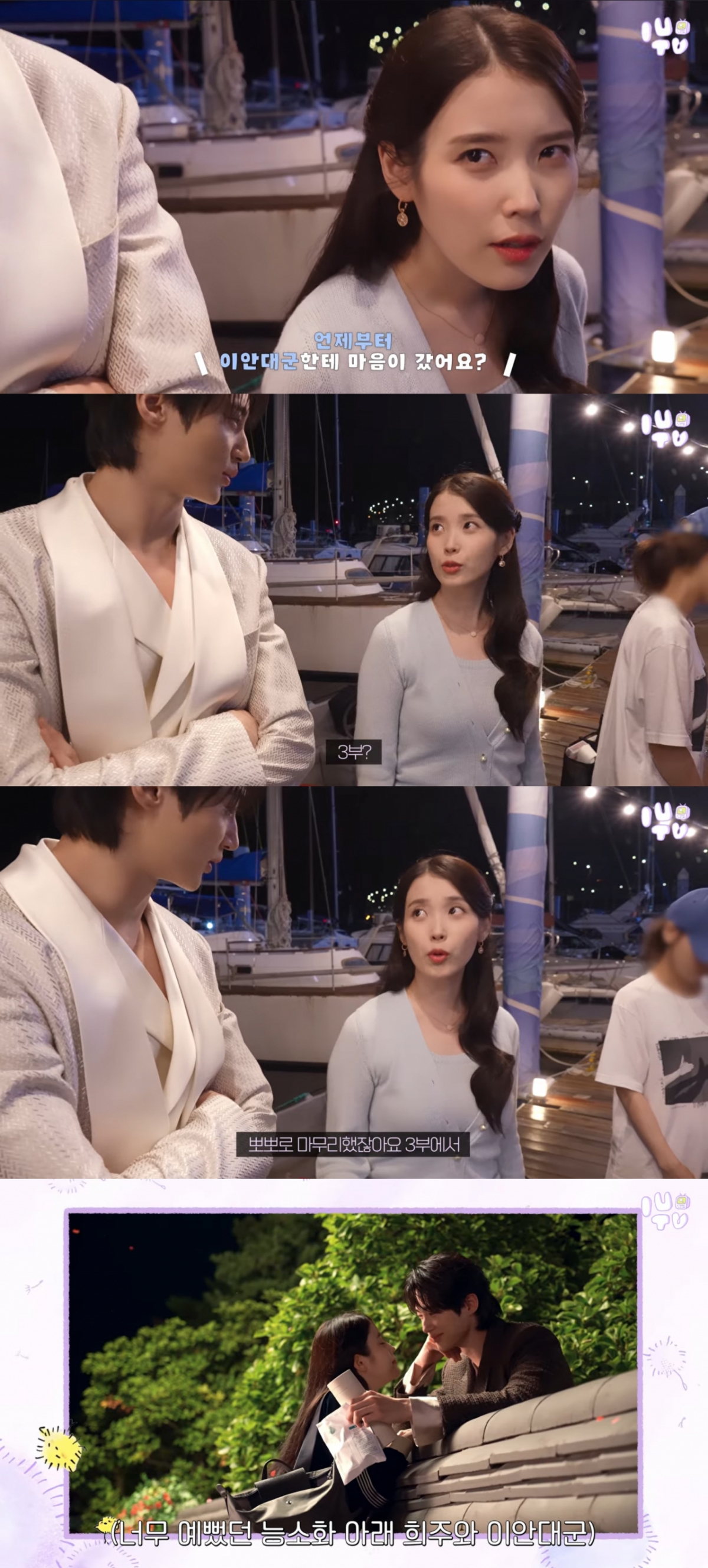 영상 속 아이유는 배 이름을 묻자 자신의 캐릭터 이름을 따 "크루희주"라고 답했다. 이어 극 중 배역인 성희주가 이안 대군(변우석 분)에게 언제부터 마음이 갔느냐는 물음에는 "3부 부터"라고 밝혔다. 아이유는 "3부에서 뽀뽀로 마무리하지 않았나. 그때 자각은 못 했어도 마음의 싹을 텄다"고 설명했다.