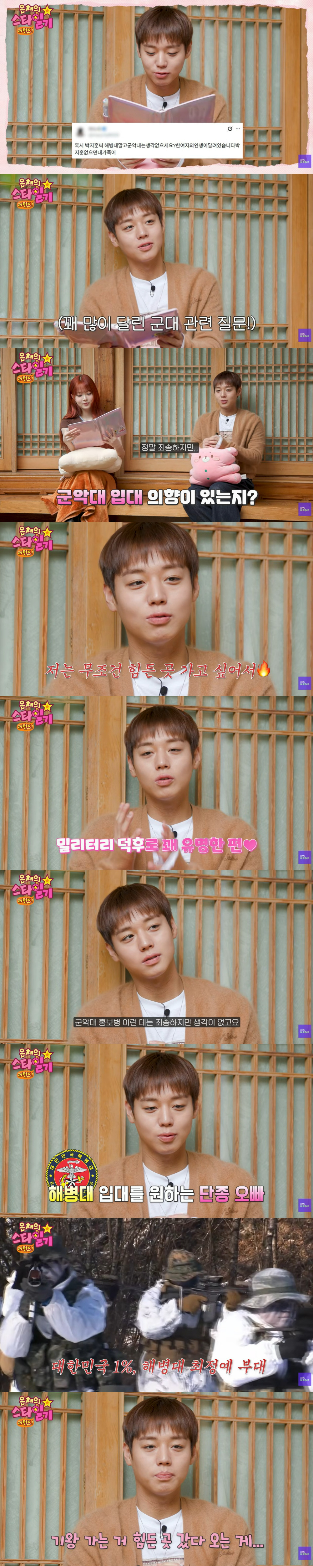 그러면서 박지훈은 "해병대보다 '해병 수색대'를 꼭 지원하고 싶다"라고 뜻을 강조했다. 그는 "해병대도 지원해서 가는 거지만, 그 안에서도 시험 봐서 봐야 하는 좀 더 힘든 부대가 있다"라고 얘기했다.