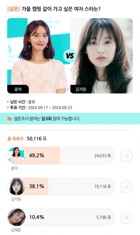 이번 투표에서 윤아는 2만 4633표를 얻고 정상을 차지했다. 이어 김지원이 1만 9118표와 함께 2위, 김혜윤이 5198표와 함께 3위에 이름을 올렸다.