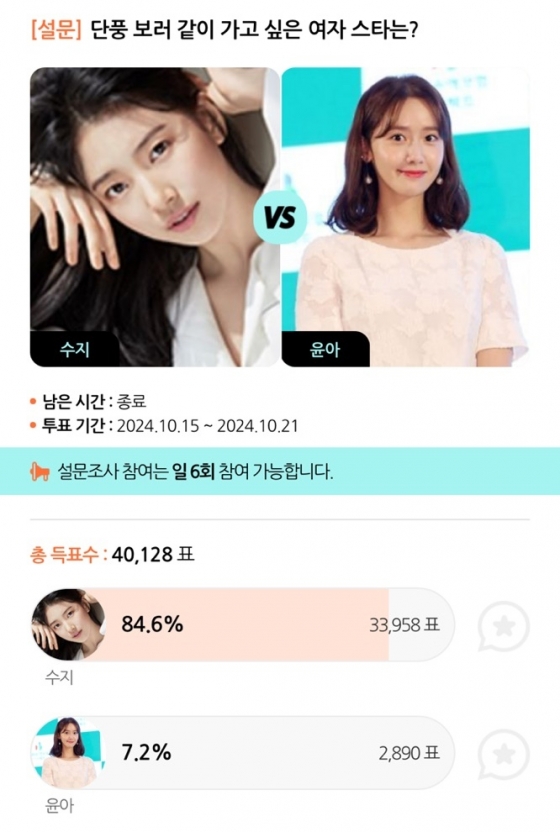 수지는 지난 10월 15일부터 10월 21일까지 종합 엔터테인먼트 모바일 앱 스타폴(STARPOLL)에서 진행된 '단풍 보러 같이 가고 싶은 여자 스타는?' 설문에서 1위에 올랐다.