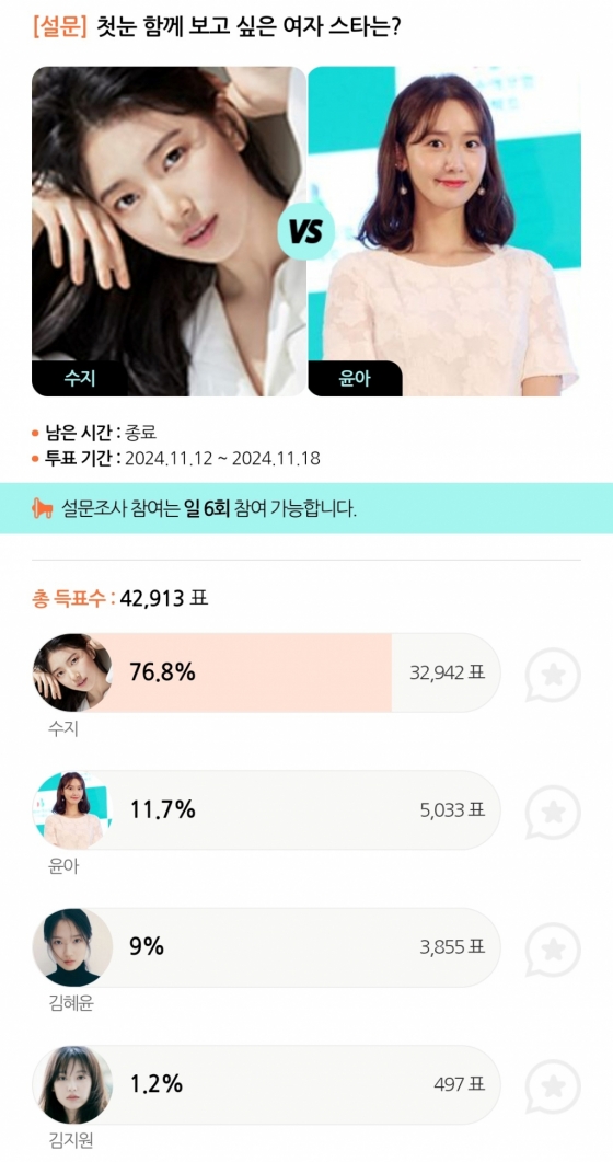 수지는 지난 12일부터 18일까지 종합 엔터테인먼트 모바일 앱 스타폴(STARPOLL)에서 진행된 '첫눈 함께 보고 싶은 여자 스타는?' 설문에서 1위에 올랐다.