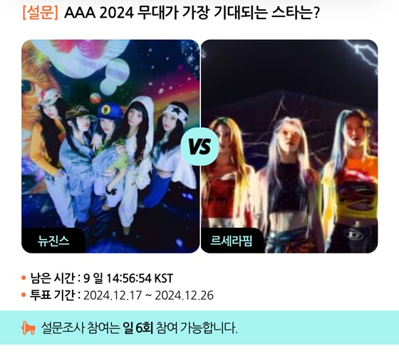 모바일 아티스트 종합 콘텐츠 앱 스타폴(STARPOLL)은 17일부터 오는 26일까지 'AAA 2024 무대가 가장 기대되는 스타는?'이라는 주제로 설문 조사를 진행한다.