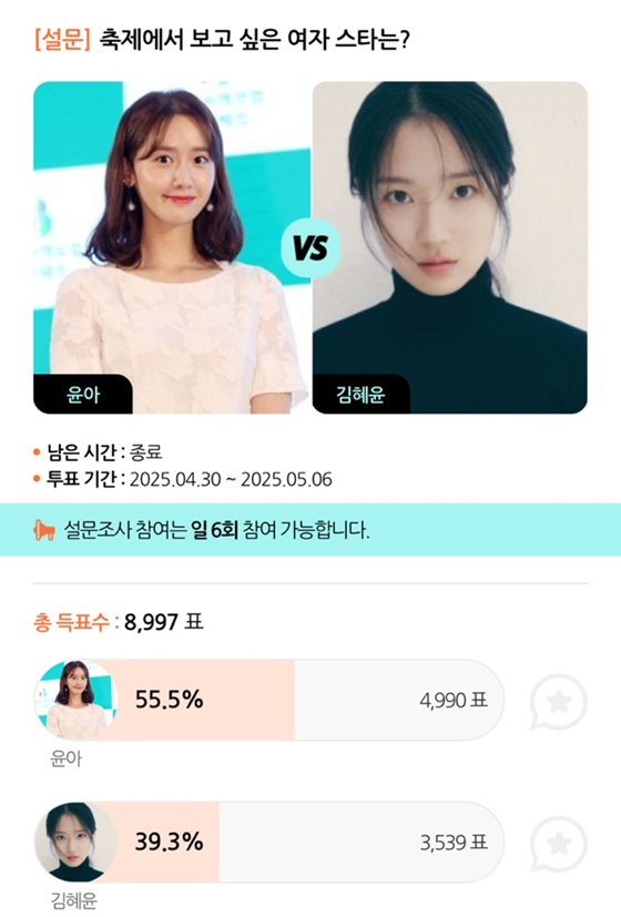 임윤아는 총득표수 8997표에서 4990표를 획득하며 1위에 올랐다.