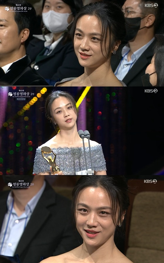 또 탕웨이는 여우주연상 수상자로 호명되자 활짝 웃으며 일어나서 박해일과 포옹을 나눴다. 이어 '헤어질 결심' 배우들과 인사한 탕웨이는 '헤어질 결심' 대본을 들고 무대에 올랐다. 탕웨이는 청룡 트로피를 건네 받고서 "이거 정말 좋아요"라고 발랄한 한국말로 소감을 말해 웃음을 자아냈다.