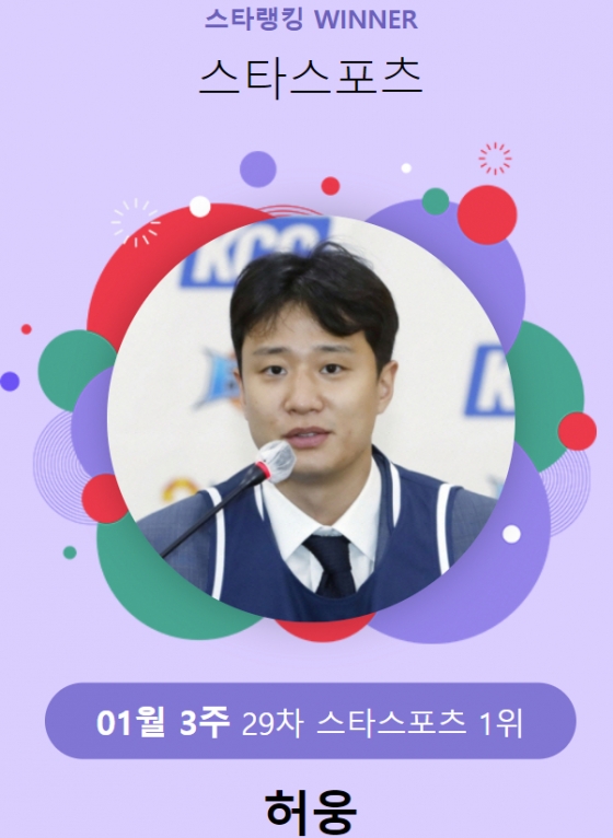 허웅은 스타뉴스가 지난 12일 오후 3시 1분부터 19일 오후 3시까지 일주일 동안 진행한 스타랭킹 스타스포츠 29차(1월 3주) 투표에서 8147표를 얻어 1위를 차지했다. 지난해 6월 30일 스타랭킹에 스포츠 부문이 추가된 후 단 한 번도 선두를 양보하지 않았다.