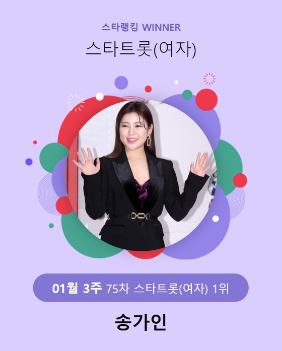 송가인은 1월 12일 오후 3시 1분부터 1월 19일 오후 3시까지 진행된 1월 3주 스타트롯 여자 랭킹 투표(75차)에서 1위를 차지했다. 이는 75주 연속 1위다.
