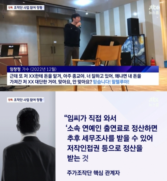 JTBC는 1일 주가조작단이 개최한 행사에 참석한 임창정의 발언을 공개했다. 또한 주가조작단과 동업한 정확을 포착했다고 단독보도했다.