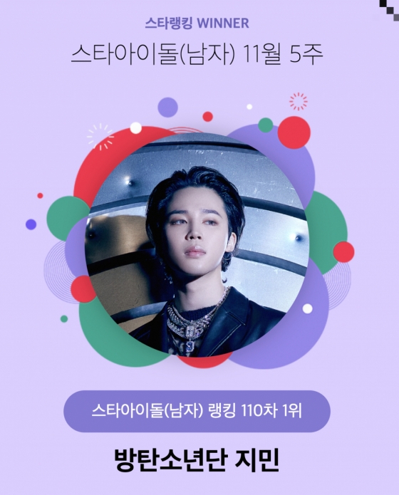 지민은 지난 11월 30일 오후 3시 1분부터 7일 오후 3시까지 진행된 11월 5주(110차) 스타랭킹 스타아이돌 남자 랭킹 투표에서 3만2354표를 얻으며 1위에 올랐다.