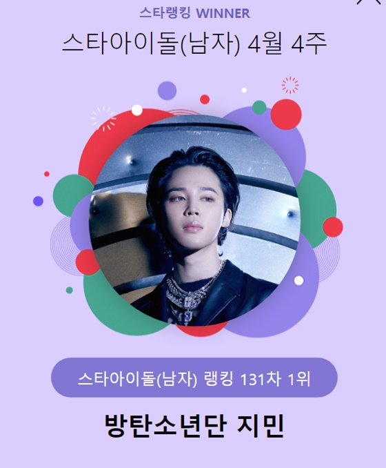 지민은 지난 4월 25일 오후 3시 1분부터 5월 2일 오후 3시까지 진행된 4월 4주(131차) 스타랭킹 스타아이돌 남자 랭킹 투표에서 3만5221표를 얻어 1위를 차지했다.