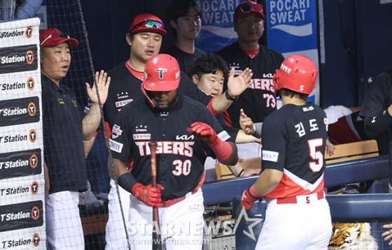 이어 김선빈의 땅볼 타구 때 홈을 밟았다. 김도영의 올 시즌 135번째 득점. 이로써 김도영은 팀 선배 서건창(당시 넥센)이 2014년 달성한 KBO 단일 시즌 최다 득점 기록과 어깨를 나란히 하게 됐다. KIA 팬들이 더 열광적인 응원으로 화답했다.