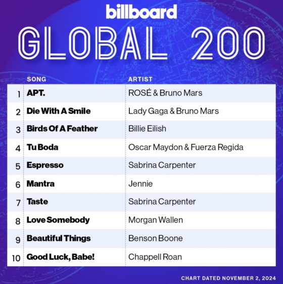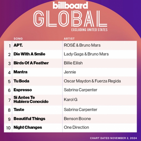 29일(이하 한국시각) 빌보드 차트 예고 리포트에 따르면 'APT.'는 2024년 11월 2일 자 빌보드 핫100 차트 8위에 랭크될 예정이다. 세부 차트에서도 'APT.'는 해당 주차 빌보드 최다 스트리밍 송 차트 2위에 올랐고, 빌보드 글로벌 200 차트와 빌보드 글로벌(미국 제외) 차트에서는 나란히 정상을 차지했다.